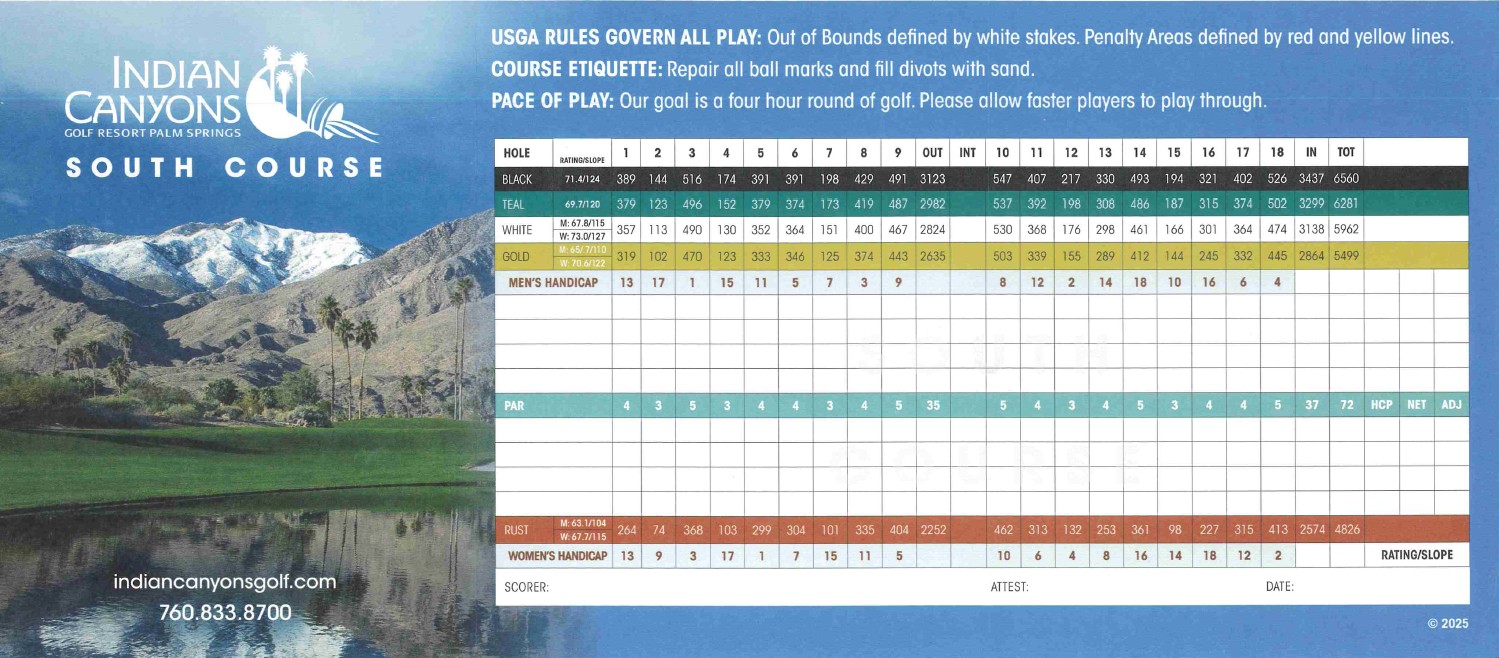 In 2004, architect Casey O'Callahan remodeled the 6,582-yard layout with player consultant, LPGA legend Amy Alcott, who has helped make the South an area women's favorite from the 4,878-yard forward tees. This scenic course is home to four ponds and 850 palm trees. Washingtonia filifera palms, the only palm native to the California desert, are abundant throughout the resort. Golfers will particularly enjoy the South's five par 5s to take on during the round.